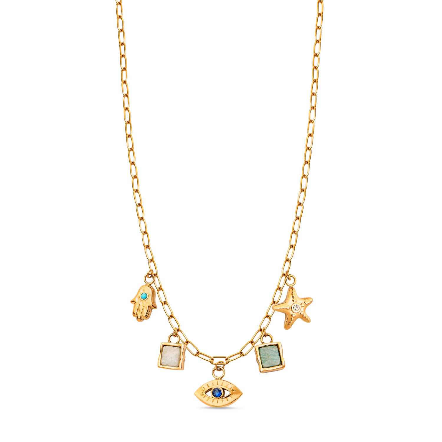 Dreaming of that beachy retreat? Our Ocean Charm Necklace lets you carry a piece of paradise with you. Crafted with 18k gold plating and a unique molten texture, each charm is custom-made to be one of a kind, just like you. Filled with meaning, designer-inspired details and semi-precious stones, choose from hanging suns, starfish, shells and even protective evil eyes. Stack, layer, build your story, one charm at a time. Plus, with tarnish and waterproof plating, it’s ready for whatever life brings your way.