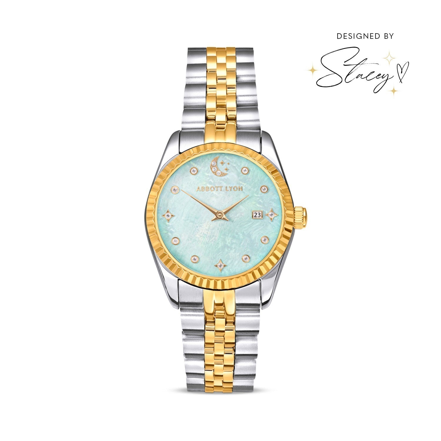 Your favorite Stacey Solomon piece just got a dreamy update. Gaze at blue skies all day long with this limited-edition two-tone watch, now with a light-catching aqua mother of pearl dial. Part of our exclusive To The Moon and Back Collection, every detail is made to last.